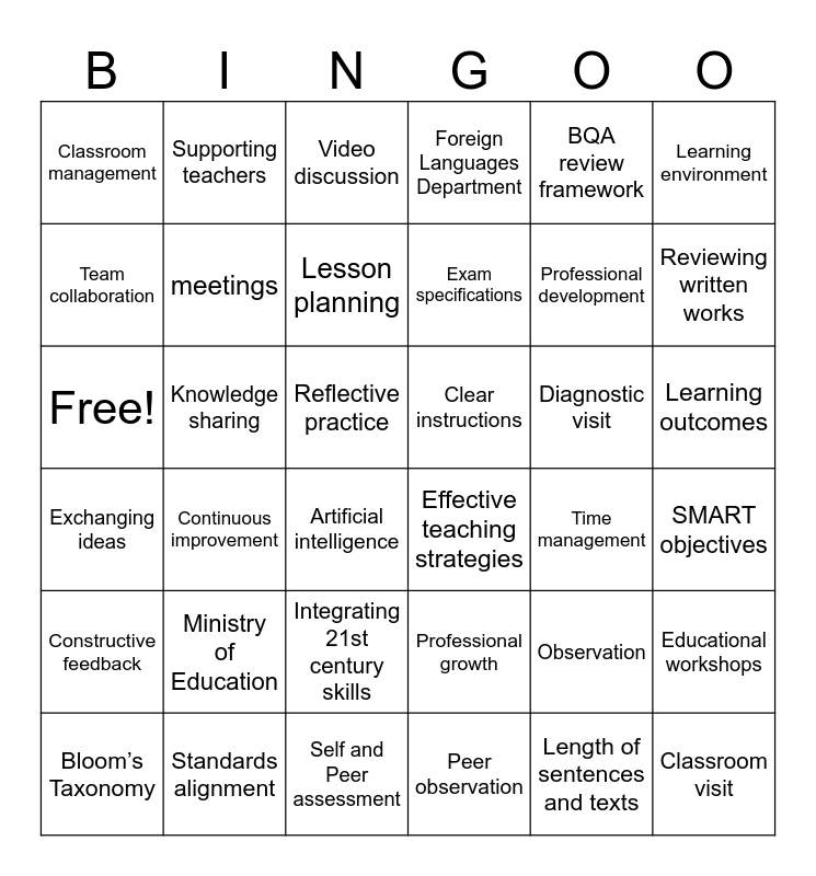 This bingo card has 36 words: Professional growth, Integrating 21st century skills, Peer observation, Team collaboration, Exchanging ideas, Clear instructions, meetings, Self and Peer assessment, BQA review framework, Observation, Reviewing written works, Foreign Languages Department, Educational workshops, Knowledge sharing, Exam specifications, Classroom management, Constructive feedback, Diagnostic visit, Free!, Video discussion, Reflective practice, Continuous improvement, Effective teaching strategies, Artificial intelligence, Time management, Supporting teachers, Professional development, Standards alignment, Lesson planning, Learning environment, Classroom visit, Bloom’s Taxonomy, SMART objectives, Learning outcomes, Ministry of Education and Length of sentences and texts.