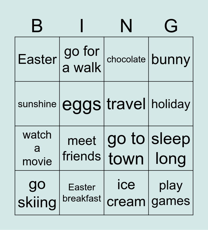 This bingo card has 16 words: go skiing, Easter breakfast, chocolate, bunny, sunshine, go for a walk, go to town, sleep long, Easter, eggs, ice cream, holiday, watch a movie, meet friends, travel and play games.
