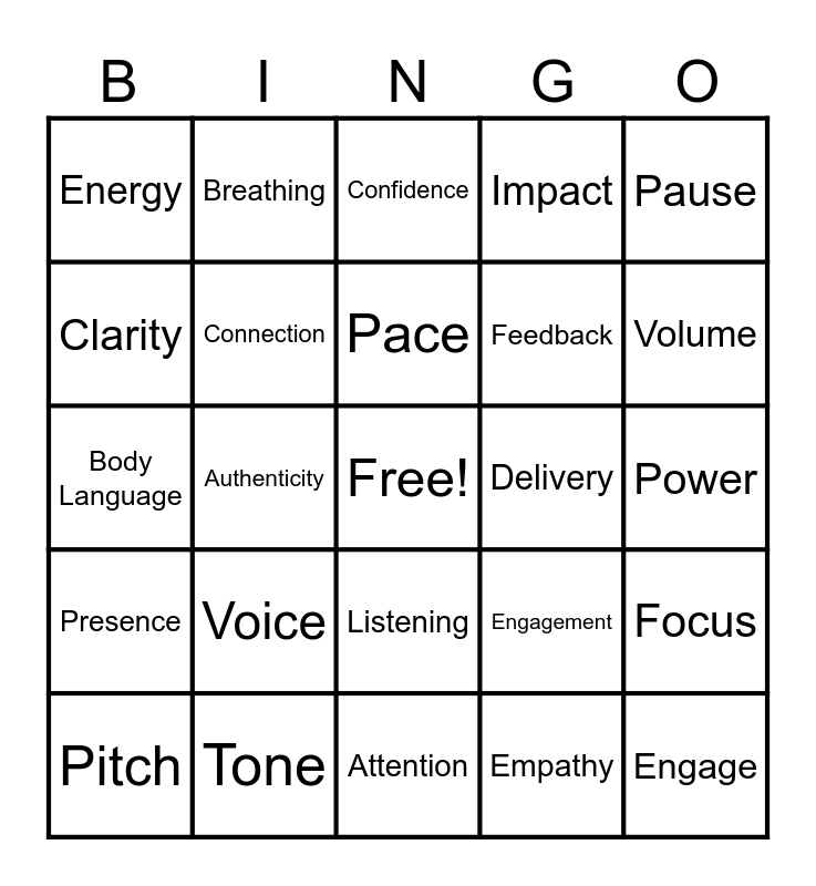 This bingo card has a free space and 24 words: Voice, Tone, Pace, Pitch, Pause, Energy, Clarity, Breathing, Delivery, Listening, Feedback, Body Language, Engagement, Focus, Connection, Empathy, Power, Confidence, Volume, Authenticity, Engage, Presence, Impact and Attention.