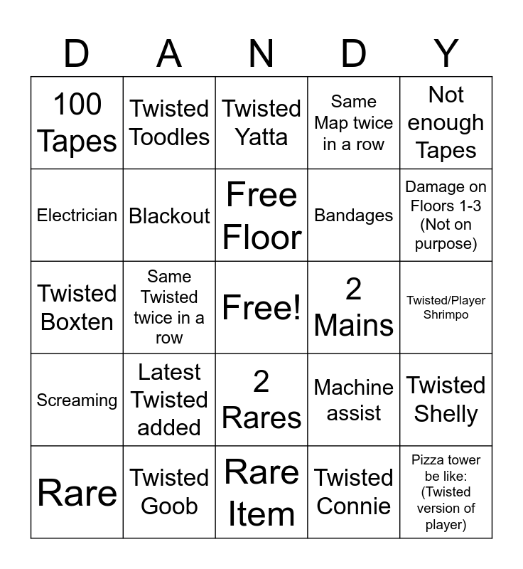 This bingo card has a free space and 39 words: 2 Commons, Main Twisted, Dandy selling useless items, Blackout, Rare, 2 Rares, Free Floor, Dandy being useful, Not enough Tapes, Screaming, Same Twisted twice in a row, Same Map twice in a row, Pizza tower be like: (Twisted version of player), Twisted/Player Shrimpo, 2 Mains, Latest Twisted added, Main featured today, 100 Tapes, Someone does 2 or more machines, Machine assist, Electrician, Rare Item, Bandages, Damage on Floors 1-3 (Not on purpose), Twisted Finn, Twisted Brightney, Twisted Rodger, Twisted Gigi, Twisted Vee, Twisted Toodles, Twisted Bassie, Twisted Cocoa, Twisted Yatta, Twisted Goob, Twisted Connie, Twisted Scraps, Twisted Shelly, Twisted Boxten and Twisted Eggson.