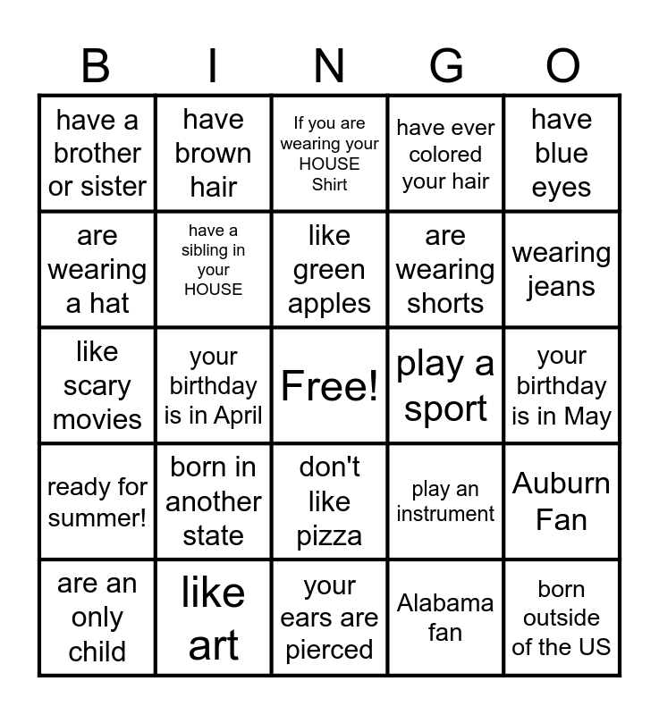 This bingo card has a free space and 24 words: born in another state, like art, like green apples, are an only child, have blue eyes, have a brother or sister, are wearing a hat, have brown hair, play a sport, don't like pizza, are wearing shorts, like scary movies, play an instrument, Auburn Fan, have a sibling in your HOUSE, Alabama fan, your birthday is in May, If you are wearing your HOUSE Shirt, wearing jeans, your birthday is in April, born outside of the US, ready for summer!, have ever colored your hair and your ears are pierced.