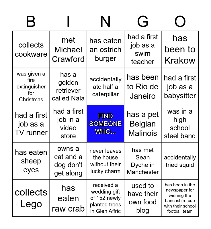 This bingo card has a free space and 35 words: has eaten cricket, met Robbie Coltrane at his house, believes that English cuisine isn't the best, has a golden retriever called Nala, never leaves the house without their lucky charm, had a first job as a swim teacher, was given a fire extinguisher for Christmas, was a member of a choir on Songs of Praise, accidentally ate half a caterpillar, has eaten pigeon, had a first job as a TV runner, has been to Krakow, has eaten buffalo, believes oysters are the most overrated food on the planet, collects cookware, has a pet Belgian Malinois, used to have their own food blog, had a first job in a video store, has eaten sheep eyes, has been in the newspaper for winning the Lancashire cup with their school football team, has met Sean Dyche in Manchester, collects Lego, accidentally tried squid, has eaten raw crab, has eaten an ostrich burger, had a first job as a babysitter, believes red wine only belongs with red meat, was on BBC Scotland News walking down Buchanan Street, has been to Rio de Janeiro, was in a high school steel band, collects old bank notes, received a wedding gift of 152 newly planted trees in Glen Affric, owns a cat and a dog don't get along, met Michael Crawford and loves paddleboarding.