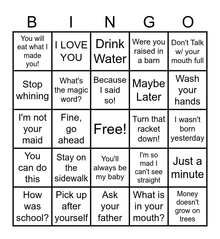 This bingo card has a free space and 34 words: Don't Touch That!, What is in your mouth?, NO!, Listen to your father, You can do this, What's the magic word?, Don't Talk w/ your mouth full, How was school?, I LOVE YOU, Eat your vegetables, Because I said so!, Drink Water, Brush your teeth, Don't run in the house, Turn that racket down!, Wash your hands, Pick up after yourself, I'm not your maid, Stay on the sidewalk, I'm so mad I can't see straight, You'll always be my baby, I'm not going to tell you again, You will eat what I made you!, I wasn't born yesterday, Ask your father, Money doesn't grow on trees, Were you raised in a barn, Wash behind your ears, Maybe Later, Stop whining, KEEP IT DOWN, Fine, go ahead, Just a minute and Did you forget something?.