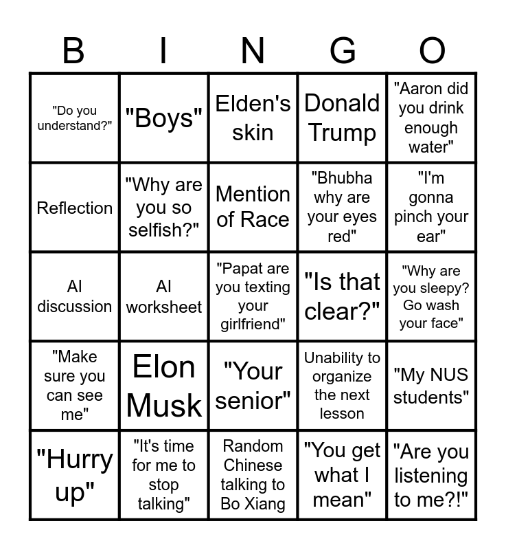 This bingo card has 25 words: Elon Musk, Random Chinese talking to Bo Xiang, Mention of Race, "Hurry up", "Aaron did you drink enough water", "Do you understand?", Reflection, "Boys", "Is that clear?", "Your senior", "Bhubha why are your eyes red", AI discussion, Unability to organize the next lesson, "My NUS students", "Why are you so selfish?", "Are you listening to me?!", "Why are you sleepy? Go wash your face", Elden's skin, "I'm gonna pinch your ear", AI worksheet, "Papat are you texting your girlfriend", "It's time for me to stop talking", "Make sure you can see me", Donald Trump and "You get what I mean".