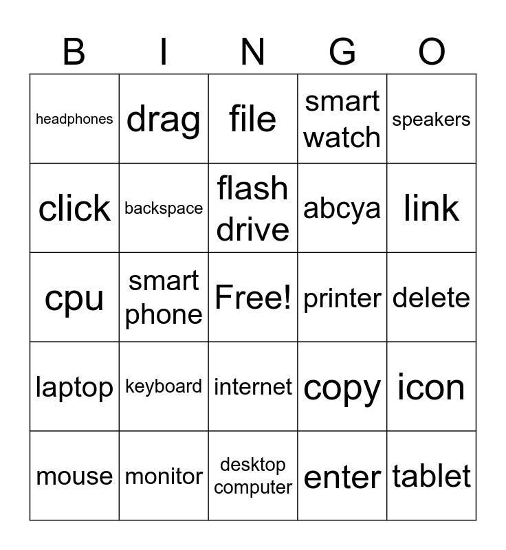 This bingo card has a free space and 24 words: keyboard, monitor, flash drive, mouse, speakers, headphones, click, drag, printer, internet, abcya, cpu, copy, icon, backspace, enter, delete, file, link, smart phone, tablet, laptop, smart watch and desktop computer.