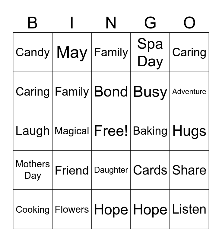 This bingo card has a free space and 24 words: Friend, Flowers, Bond, Cooking, Caring, Candy, Caring, May, Baking, Daughter, Busy, Laugh, Cards, Share, Family, Hope, Hugs, Family, Adventure, Magical, Listen, Mothers Day, Spa Day and Hope.