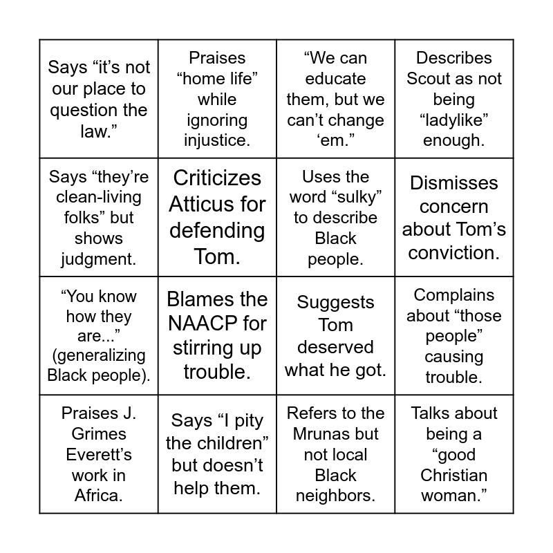 This bingo card has 16 words: Praises J. Grimes Everett’s work in Africa., Says “I pity the children” but doesn’t help them., “We can educate them, but we can’t change ‘em.”, Describes Scout as not being “ladylike” enough., Says “they’re clean-living folks” but shows judgment., Praises “home life” while ignoring injustice., Suggests Tom deserved what he got., Complains about “those people” causing trouble., Says “it’s not our place to question the law.”, Criticizes Atticus for defending Tom., Refers to the Mrunas but not local Black neighbors., Dismisses concern about Tom’s conviction., “You know how they are...” (generalizing Black people)., Blames the NAACP for stirring up trouble., Uses the word “sulky” to describe Black people. and Talks about being a “good Christian woman.”.