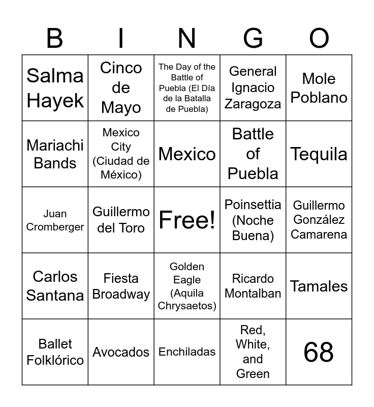 This bingo card has a free space and 24 words: Fiesta Broadway, Avocados, Mexico, Ballet Folklórico, Mole Poblano, Salma Hayek, Mariachi Bands, Cinco de Mayo, Poinsettia (Noche Buena), Golden Eagle (Aquila Chrysaetos), Battle of Puebla, Juan Cromberger, Ricardo Montalban, Tamales, Mexico City (Ciudad de México), Red, White, and Green, Guillermo González Camarena, The Day of the Battle of Puebla (El Día de la Batalla de Puebla), Tequila, Guillermo del Toro, 68, Carlos Santana, General Ignacio Zaragoza and Enchiladas.