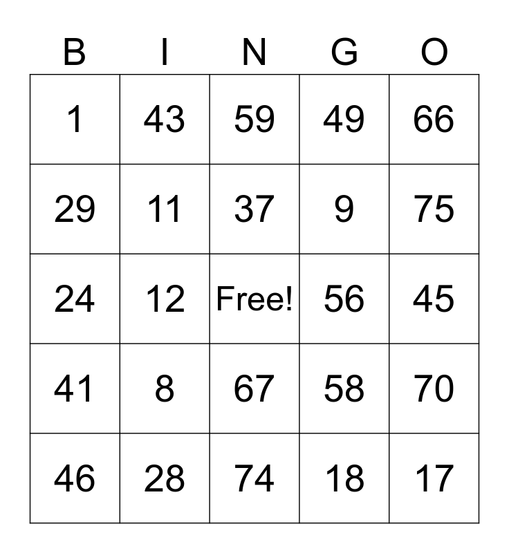 This bingo card has a free space and 24 words: 8, 28, 37, 46, 66, 1, 29, 43, 56, 67, 9, 24, 58, 70, 11, 18, 45, 59, 75, 12, 17, 41, 49 and 74.