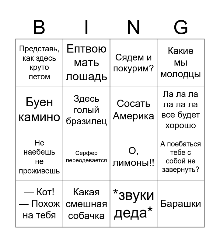 This bingo card has 16 words: Какая смешная собачка, А поебаться тебе с собой не завернуть?, Сядем и покурим?, Представь, как здесь круто летом, Не наебешь не проживешь, Ептвою мать лошадь, О, лимоны!!, *звуки деда*, Буен камино, Здесь голый бразилец, — Кот! — Похож на тебя, Какие мы молодцы, Серфер переодевается, Ла ла ла ла ла ла все будет хорошо, Сосать Америка and Барашки.