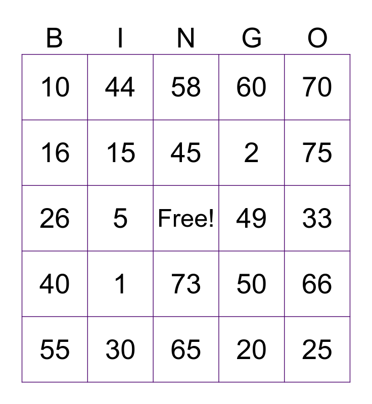 This bingo card has a free space and 24 words: 1, 30, 45, 55, 70, 10, 16, 44, 49, 73, 2, 26, 50, 66, 15, 20, 33, 58, 75, 5, 25, 40, 60 and 65.