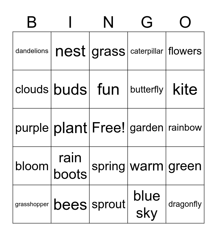 This bingo card has a free space and 59 words: April, bees, birds, bloom, blue sky, breeze, buds, bunny, butterfly, buzzing, caterpillar, chirp, clouds, daffodil, daisies, dandelions, dragonfly, flowers, frogs, fun, garden, grass, grasshopper, green, grow, iris, ivy, yellow, kite, ladybug, leaf, March, May, nature, nest, orchid, picnic, plant, puddle, purple, rain, rain boots, rainbow, seeds, showers, snail, soil, splash, spring, sprout, sun, sunny, tree, tulip, umbrella, warm, weather, windy and yard.