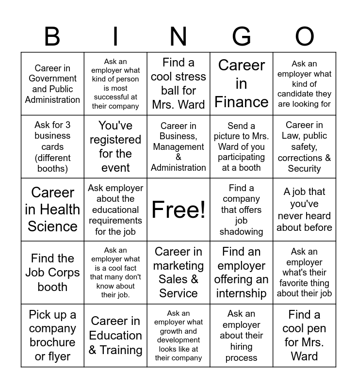 This bingo card has a free space and 24 words: Ask an employer what is a cool fact that many don't know about their job., Career in Education & Training, Career in Business, Management & Administration, Pick up a company brochure or flyer, Ask an employer what kind of candidate they are looking for, Career in Government and Public Administration, Ask for 3 business cards (different booths), Ask an employer what kind of person is most successful at their company, Find a company that offers job shadowing, Career in marketing Sales & Service, Send a picture to Mrs. Ward of you participating at a booth, Career in Health Science, Find an employer offering an internship, Ask an employer what's their favorite thing about their job, You've registered for the event, Ask an employer about their hiring process, A job that you've never heard about before, Find a cool stress ball for Mrs. Ward, Career in Law, public safety, corrections & Security, Ask employer about the educational requirements for the job, Find a cool pen for Mrs. Ward, Find the Job Corps booth, Career in Finance and Ask an employer what growth and development looks like at their company.
