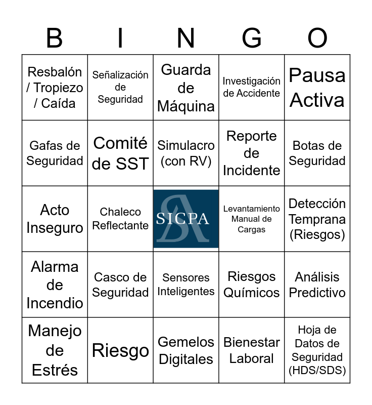 This bingo card has a free space and 86 words: IA (Inteligencia Artificial), Digitalización SST, Sensores Inteligentes, Realidad Virtual (RV), Snow SST, Plataformas Digitales, Seguridad Inteligente, Cultura Preventiva, Prevención de Riesgos, Reporte de Incidentes, IoT (Internet de las Cosas), Big Data (en SST), Análisis Predictivo, Detección Temprana (Riesgos), Entrenamiento Inmersivo, Simulacro (con RV), Primeros Auxilios (RV), Riesgo Eléctrico (RV), Inspecciones Digitales, Incidentes, Comunicación (Tiempo Real), Acceso a Procedimientos, Acto Inseguro, Privacidad (Datos SST), Bienestar Laboral, Participación Activa, Condición Insegura, Mentalidad de Seguridad, Personas Primero / Activo Valioso, Peligro, Riesgo, Evaluación de Riesgos, EPP (Equipo Protección Personal), Casco de Seguridad, Gafas de Seguridad, Guantes Nitrilo, Botas de Seguridad, Protección Auditiva, Protección Respiratoria, Chaleco Reflectante, Estrés, Ergonomía, Postura Correcta, Levantamiento Manual de Cargas, Movimiento Repetitivo, Pausa Activa, Organización y Seguridad (6S), Señalización de Seguridad, Salida de Emergencia, Ruta de Evacuación, Punto de Reunión, Extintor de Incendios, Alarma de Incendio, Simulacro de Evacuación, Plan de Emergencia, RCP, Botiquín de Primeros Auxilios, Reporte de Incidente, Investigación de Accidente, Comité de SST, Resbalón / Tropiezo / Caída, Piso Mojado / Resbaloso, Obstrucción en Pasillo, Seguridad Eléctrica, LOTO (Bloqueo y Etiquetado), Guarda de Máquina, Riesgo Químico, Hoja de Datos de Seguridad (HDS/SDS), Etiqueta (Producto Químico), Almacenamiento Seguro (Químicos), Ruido Excesivo, Higiene Personal, Manejo de Estrés, Fatiga Laboral, Procedimiento Seguro de Trabajo, Bournout, Gemelos Digitales, Salud Mental, Mindfulnes, Factores de Riesgos, Riesgos Físicos, Riesgos Mecánicos, Riesgos Psicosociales, Riesgos Ambientales, Riesgos Químicos and Isoesqueletos.