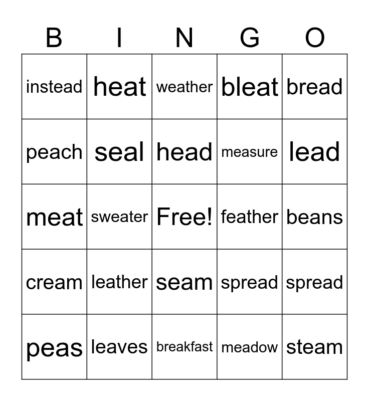 This bingo card has a free space and 24 words: leather, leaves, head, peas, bread, instead, peach, heat, feather, seam, measure, meat, spread, spread, seal, meadow, beans, weather, lead, sweater, steam, cream, bleat and breakfast.