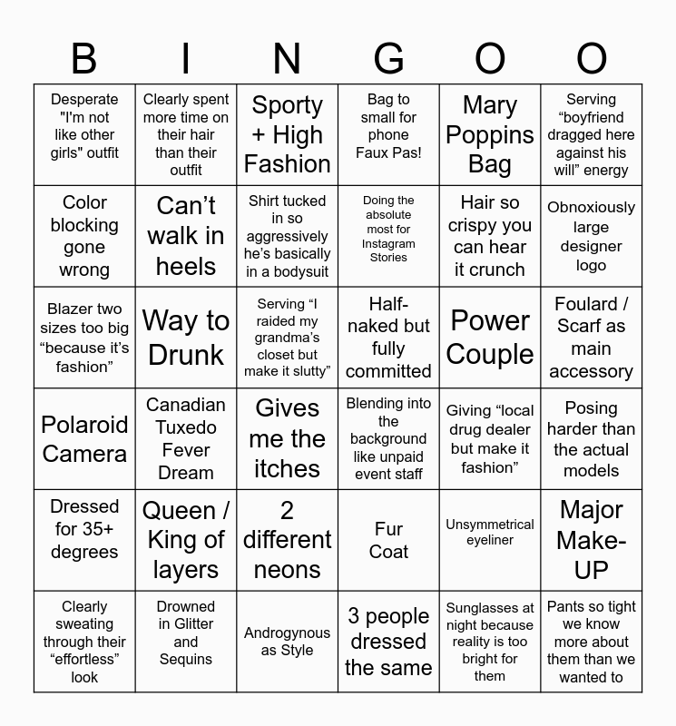 This bingo card has 36 words: Fur Coat, 2 different neons, 3 people dressed the same, Color blocking gone wrong, Polaroid Camera, Half-naked but fully committed, Can’t walk in heels, Androgynous as Style, Mary Poppins Bag, Unsymmetrical eyeliner, Obnoxiously large designer logo, Bag to small for phone Faux Pas!, Major Make-UP, Way to Drunk, Doing the absolute most for Instagram Stories, Desperate "I'm not like other girls" outfit, Dressed for 35+ degrees, Power Couple, Blazer two sizes too big “because it’s fashion”, Sporty + High Fashion, Serving “I raided my grandma’s closet but make it slutty”, Canadian Tuxedo Fever Dream, Blending into the background like unpaid event staff, Gives me the itches, Giving “local drug dealer but make it fashion”, Clearly spent more time on their hair than their outfit, Hair so crispy you can hear it crunch, Drowned in Glitter and Sequins, Shirt tucked in so aggressively he’s basically in a bodysuit, Serving “boyfriend dragged here against his will” energy, Pants so tight we know more about them than we wanted to, Clearly sweating through their “effortless” look, Posing harder than the actual models, Foulard / Scarf as main accessory, Queen / King of layers and Sunglasses at night because reality is too bright for them.
