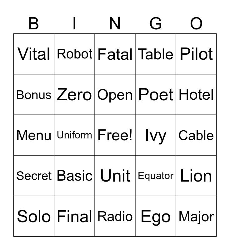 This bingo card has a free space and 24 words: Basic, Final, Open, Solo, Pilot, Vital, Bonus, Robot, Ivy, Unit, Poet, Menu, Equator, Lion, Zero, Ego, Cable, Fatal, Hotel, Uniform, Major, Secret, Table and Radio.