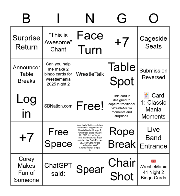 This bingo card has a free space and 40 words: ChatGPT, Log in, You said:, Can you help me make 2 bingo cards for wrestlemania 2025 night 2, ChatGPT said:, Absolutely! Let's create two customized bingo cards for WrestleMania 41 Night 2, which took place on April 20, 2025, in Las Vegas. This event featured major matches like Cody Rhodes vs. John Cena for the Undisputed WWE Championship, a triple-thr, WrestleTalk, +7, Cageside Seats, +7, SBNation.com, +7, 🎟️ WrestleMania 41 Night 2 Bingo Cards, 🃏 Card 1: Classic Mania Moments, This card is designed to capture traditional WrestleMania moments and surprises., Free Space, Title Change, Surprise Return, Heel Turn, Face Turn, Live Band Entrance, Chair Shot, Table Spot, Announcer Table Breaks, Pyro During Entrance, Outside Interference, Referee Bump, Someone Cheats, Superstar Cries, Wrestler Wears Movie-Inspired Gear, WWE Legend Returns, Corey Makes Fun of Someone, Product Placement, Rope Break, Submission Reversed, Spear, Wet Hair, Entrance Cut Short, "This is Awesome" Chant and "WOOO!" Chant.