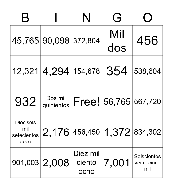 This bingo card has a free space and 24 words: 2,176, 2,008, 154,678, 901,003, 456, 45,765, 12,321, 90,098, 56,765, 456,450, 354, 932, 1,372, 834,302, 4,294, 7,001, 567,720, 372,804, 538,604, Dos mil quinientos, Seiscientos veinti cinco mil, Dieciséis mil setecientos doce, Mil dos and Diez mil ciento ocho.