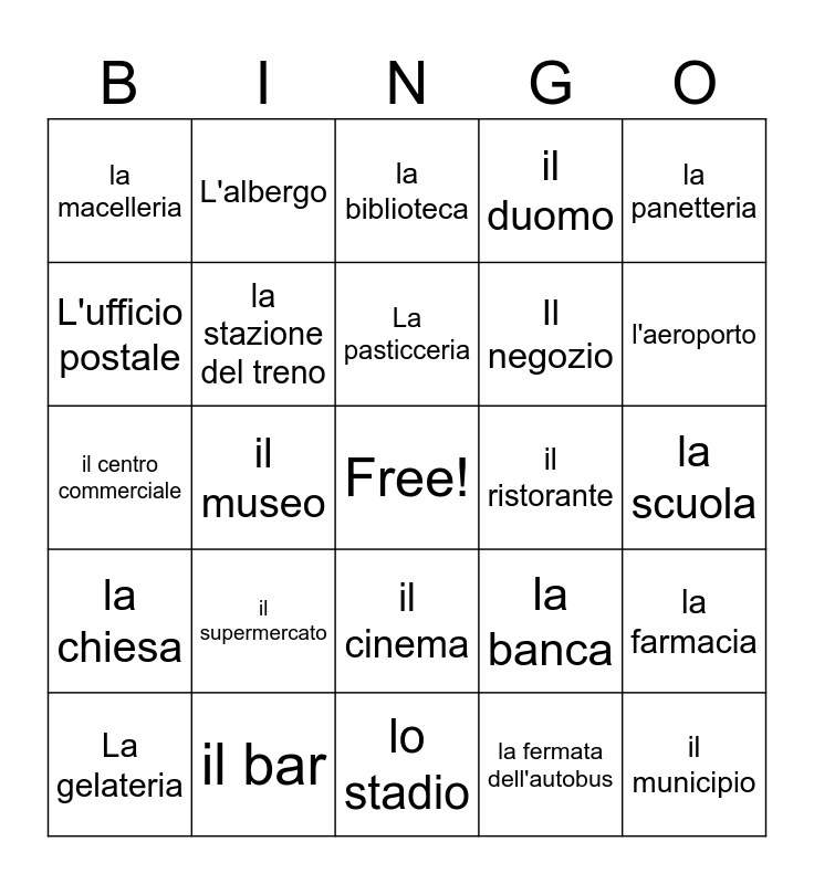 This bingo card has a free space and 24 words: il supermercato, il bar, La pasticceria, La gelateria, la panetteria, la macelleria, L'ufficio postale, L'albergo, il ristorante, il cinema, Il negozio, il centro commerciale, la banca, la farmacia, la stazione del treno, la fermata dell'autobus, la scuola, la biblioteca, l'aeroporto, il museo, il municipio, la chiesa, il duomo and lo stadio.