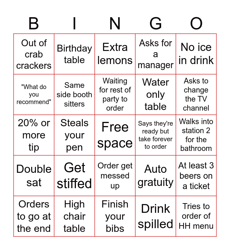 This bingo card has a free space and 24 words: Get stiffed, High chair table, Waiting for rest of party to order, Orders to go at the end, No ice in drink, Out of crab crackers, "What do you recommend", Birthday table, Says they're ready but take forever to order, Order get messed up, Water only table, 20% or more tip, Auto gratuity, At least 3 beers on a ticket, Same side booth sitters, Drink spilled, Walks into station 2 for the bathroom, Extra lemons, Asks to change the TV channel, Steals your pen, Tries to order of HH menu, Double sat, Asks for a manager and Finish your bibs.