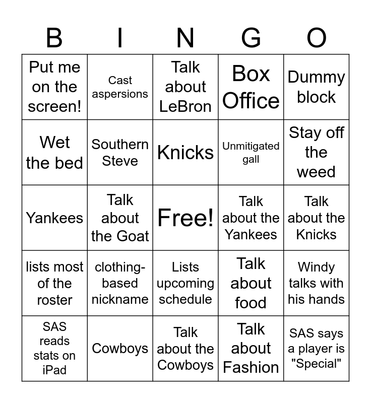 This bingo card has a free space and 31 words: Talk about the Cowboys, Talk about the weather, Talk about the Goat, Stevie loves the kids, Put me on the screen!, Talk about LeBron, Southern Steve, Talk about food, Talk about the Yankees, Talk about Fashion, Talk about the Knicks, SAS says a player is "Special", Someone says "what are we doing", A quick take gets killed, Stay off the weed, I approve this message, Windy talks with his hands, clothing-based nickname, lists most of the roster, Lists upcoming schedule, Dummy block, Brick is back!, SAS reads stats on iPad, Cast aspersions, Unmitigated gall, Wet the bed, Box Office, Yankees, Cowboys, Knicks and Lakers.