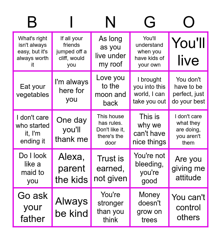 This bingo card has 28 words: Are you giving me attitude, Because I said so, I brought you into this world, I can take you out, Money doesn't grow on trees, Eat your vegetables, As long as you live under my roof, If all your friends jumped off a cliff, would you, Do I look like a maid to you, This is why we can't have nice things, Go ask your father, I don't care who started it, I'm ending it, You'll understand when you have kids of your own, Always be kind, You're stronger than you think, You don't have to be perfect, just do your best, Raising tiny humans is exhausting, Alexa, parent the kids, I'm always here for you, Love you to the moon and back, Trust is earned, not given, What's right isn't always easy, but it's always worth it, You can't control others, This house has rules. Don't like it, there's the door, One day you'll thank me, I don't care what they are doing, you aren't them, You're not bleeding, you're good, You'll live and I'll turn this car around.