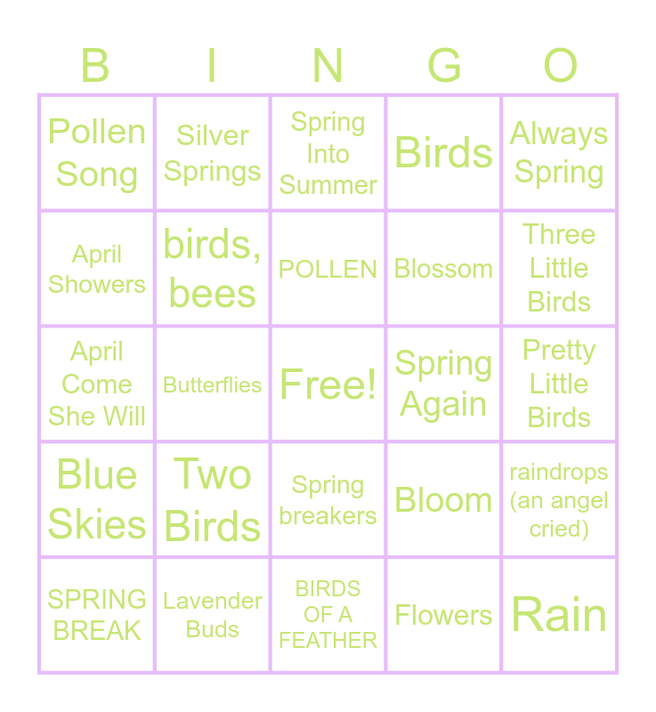 This bingo card has a free space and 24 words: Two Birds, Lavender Buds, POLLEN, SPRING BREAK, Always Spring, Pollen Song, April Showers, Silver Springs, Spring Again, Spring breakers, Blossom, April Come She Will, Bloom, raindrops (an angel cried), birds, bees, Flowers, Pretty Little Birds, Spring Into Summer, Three Little Birds, Butterflies, Rain, Blue Skies, Birds and BIRDS OF A FEATHER.