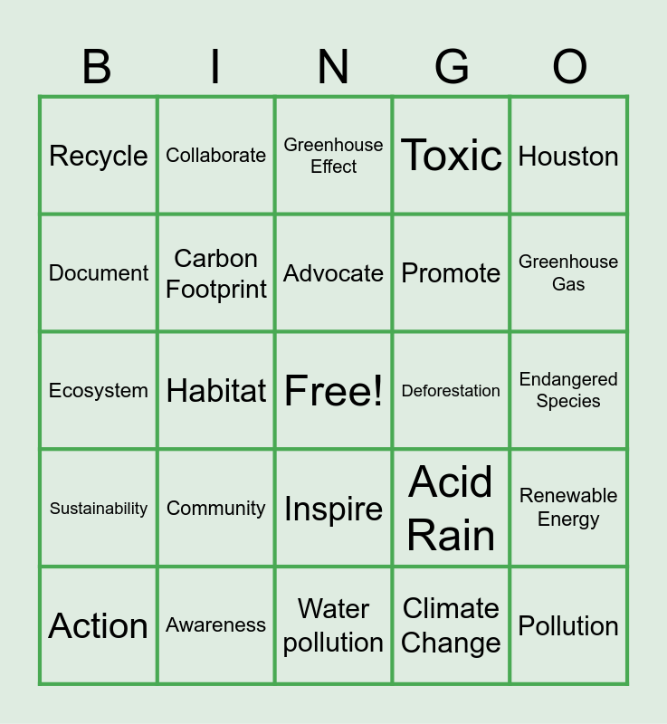 This bingo card has a free space and 24 words: Community, Awareness, Advocate, Action, Houston, Recycle, Document, Collaborate, Deforestation, Inspire, Promote, Ecosystem, Acid Rain, Renewable Energy, Carbon Footprint, Climate Change, Endangered Species, Greenhouse Effect, Greenhouse Gas, Habitat, Pollution, Sustainability, Toxic and Water pollution.