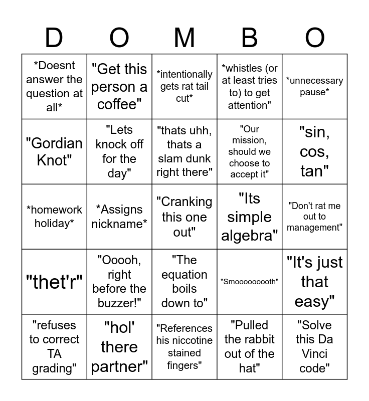 This bingo card has 36 words: Missing attendance in D2L if you showed up for class, "lets dig into our ____ toolbox", "Balance coefficients", "Lets knock off for the day", "Smooooooooth", "thet'r", "thats uhh, thats a slam dunk right there", "5 equations, 5 unknowns!", *unnecessary pause*, "Referred" (RFR), *Assigns nickname*, *whistles (or at least tries to) to get attention", "Guys, c'mon. Lets hit it", "Its simple algebra", "sin, cos, tan", *Doesnt answer the question at all*, "Solve this Da Vinci code", "Ooooh, right before the buzzer!", "Cranking this one out", *intentionally gets rat tail cut*, "Don't rat me out to management", "It's just that easy", "hol' there partner", "refuses to correct TA grading", "References his niccotine stained fingers", "Get this person a coffee", *homework holiday*, "Are you guys having a blast", "Our mission, should we choose to accept it", "Gordian Knot", "BUT!", *Rut-roh sound effect*, "Pulled the rabbit out of the hat", "The equation boils down to", "Pay dividends" and "Stick a fork in it".