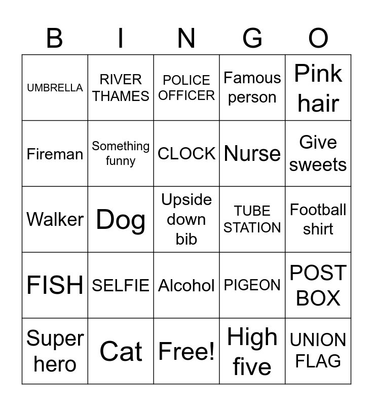 This bingo card has 29 words: Super hero, Blue hair, Dog, UNION FLAG, UMBRELLA, POLICE OFFICER, Something funny, SELFIE, TUBE STATION, Cat, Football shirt, Upside down bib, Free!, High five, Give sweets, Man dressed as woman, Alcohol, FISH, Pink hair, Walker, PIGEON, Zoo animal, Nurse, Fireman, Famous person, RIVER THAMES, POST BOX, CLOCK and CROWN.