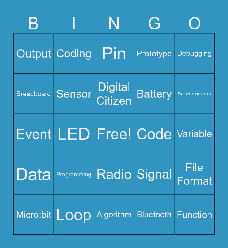 This bingo card has a free space and 29 words: Micro:bit, Microcontroller, LED, Input, Output, Pin, Sensor, Programming, Code, Loop, Variable, Function, Algorithm, Bluetooth, Accelerometer, Compass, Radio, Data, Debugging, Event, Signal, Interactivity, Battery, Breadboard, Prototype, Coding, File Format, Digital Citizen and Coder.