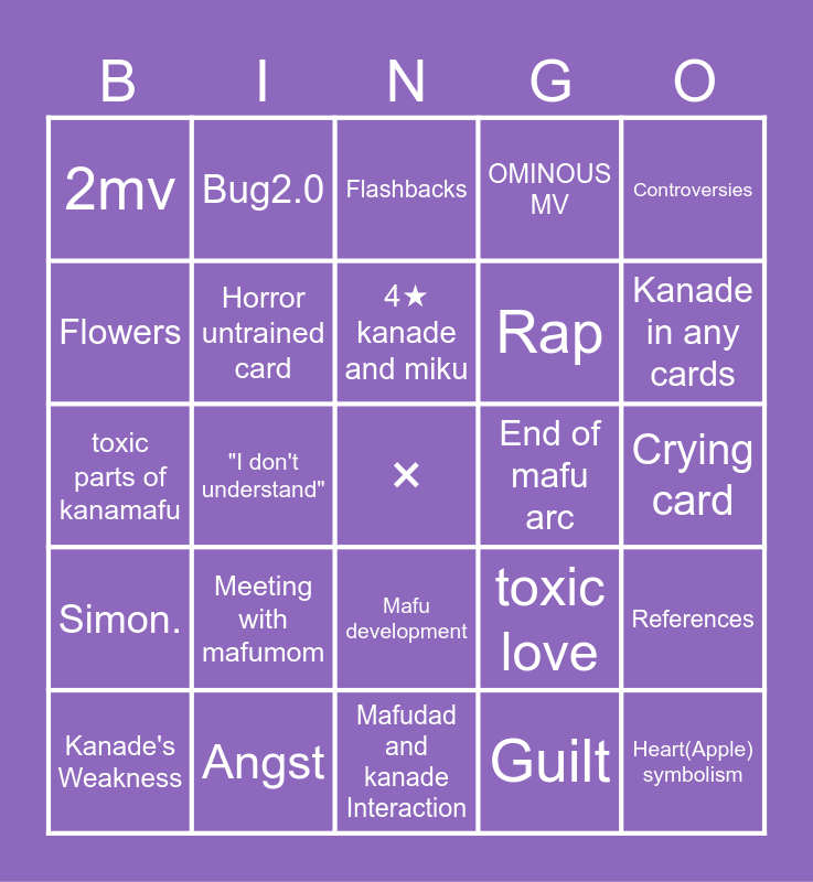 This bingo card has a free space and 24 words: Meeting with mafumom, Angst, 4★ kanade and miku, Kanade's Weakness, Controversies, 2mv, Flowers, Bug2.0, End of mafu arc, Mafu development, Rap, toxic parts of kanamafu, toxic love, References, Horror untrained card, Guilt, Crying card, Flashbacks, Kanade in any cards, "I don't understand", Heart(Apple) symbolism, Simon., OMINOUS MV and Mafudad and kanade Interaction.
