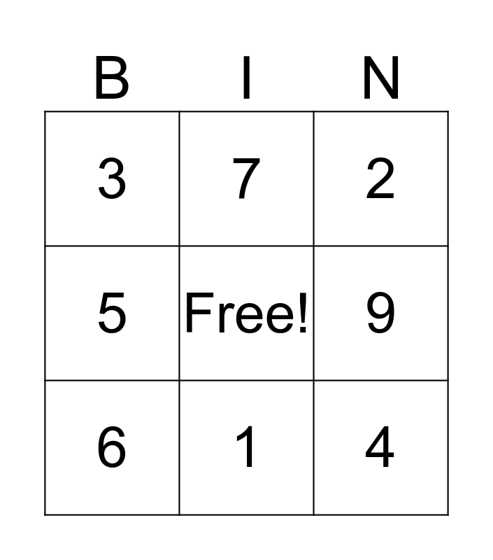 This bingo card has a free space and 10 words: 1, 2, 3, 4, 5, 6, 7, 8, 9 and 0.
