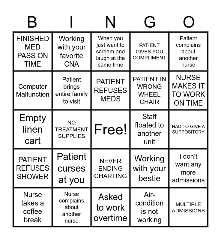 This bingo card has a free space and 39 words: CNA'S Upset about schedule, NURSE MISSED MEAL, MEDICATION MISSING FOR MED PASS, Patient brings entire family to visit, Nurse takes a coffee break, NEVER ENDING CHARTING, PATIENT REFUSES MEDS, PATIENT FALLS AT END OF SHIFT, Patient complains about another nurse, PATIENT REFUSES SHOWER, NO TREATMENT SUPPLIES, PATIENT GIVES YOU COMPLIMENT, MULTIPLE ADMISSIONS, HAD TO GIVE A SUPPOSITORY, Staff floated to another unit, Patient curses at you, Code BROWN, FINISHED MED PASS ON TIME, Unit fully staffed, Working with your bestie, Computer Malfunction, Asked to work overtime, PATIENT IN WRONG WHEEL CHAIR, NURSE MAKES IT TO WORK ON TIME, Air-condition is not working, Patient’s bed won’t go down, 20/10 Pain scale, Non stop telephone calls, Your own family asks for medical advice, Working with your favorite CNA, Patient complains about another nurse, Waiting for meds from pharmacy, When you just want to scream and laugh at the same time, Nurse complains about another nurse, Air-condition is not working, Nurses being yelled because of remote control, I don’t want any more admissions, Empty linen cart and Your own family asks for medical advice.