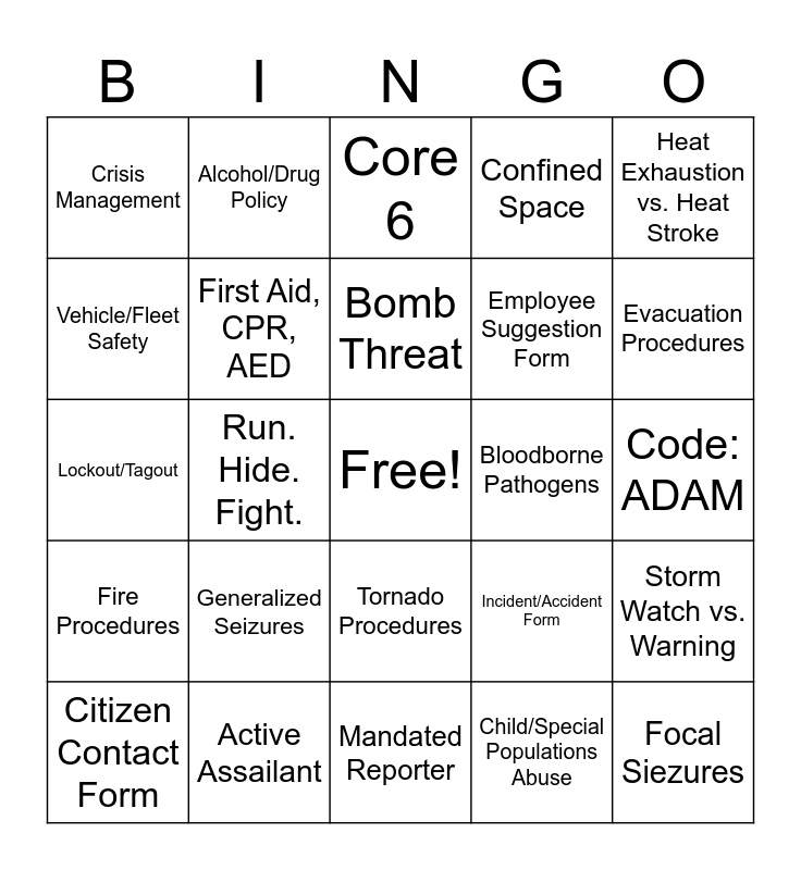 This bingo card has a free space and 29 words: Citizen Contact Form, Thorguard, Run. Hide. Fight., Statement of Admissions, Crisis Management, Core 6, First Aid, CPR, AED, Generalized Seizures, Bloodborne Pathogens, Active Assailant, Code: ADAM, Focal Siezures, Mandated Reporter, Child/Special Populations Abuse, Evacuation Procedures, 1st Amendment Audit, Tornado Procedures, Fire Procedures, Heat Exhaustion vs. Heat Stroke, Lockout/Tagout, Incident/Accident Form, Harrassment Policy, Employee Suggestion Form, Vehicle/Fleet Safety, Confined Space, Alcohol/Drug Policy, Storm Watch vs. Warning, Bomb Threat and Medication Forms.