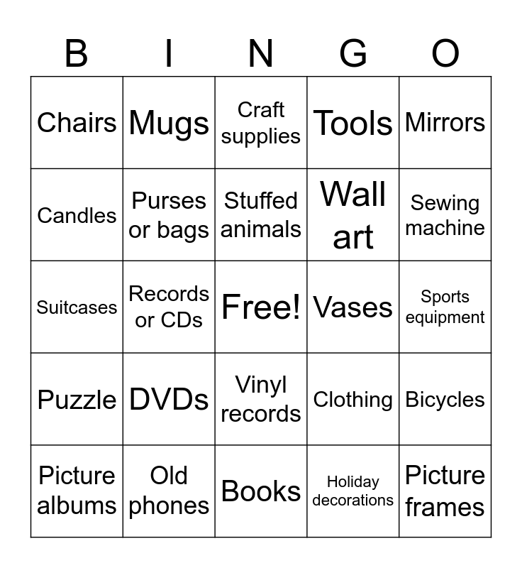 This bingo card has a free space and 48 words: Coffee maker, Picture frames, Board games, Books, DVDs, Lamps, Mugs, Garden tools, Candles, Costume jewelry, Purses or bags, Tools, Bicycles, Clothing, Shoes, Toys, Stuffed animals, Vases, Kitchen utensils, Mirrors, Records or CDs, Holiday decorations, Chairs, Wall art, Alarm clock, Sewing machine, Picture albums, Crockpot, Vinyl records, Puzzle, Candlestick holders, Curtains, Baby clothes, Lawn chairs, Old phones, Pet supplies, Bath towels, Sports equipment, Tool box, Coasters, Notebooks or journals, Tupperware, Craft supplies, Remote controls, Suitcases, Planters, Wall clocks and Scarves.