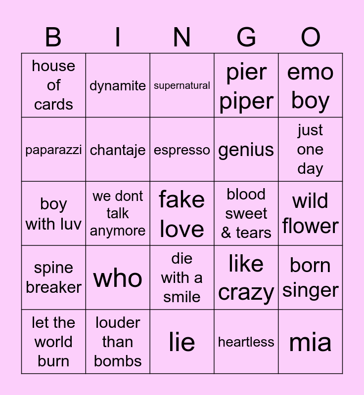 This bingo card has a free space and 24 words: who, louder than bombs, espresso, let the world burn, emo boy, house of cards, paparazzi, dynamite, blood sweet & tears, die with a smile, genius, boy with luv, like crazy, born singer, chantaje, heartless, wild flower, supernatural, just one day, we dont talk anymore, mia, spine breaker, pier piper and lie.