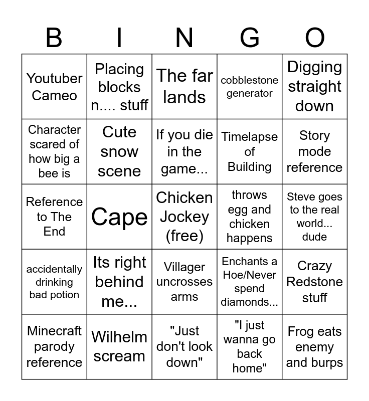 This bingo card has a free space and 24 words: Its right behind me..., Wilhelm scream, If you die in the game..., Minecraft parody reference, Digging straight down, Youtuber Cameo, Character scared of how big a bee is, Placing blocks n.... stuff, throws egg and chicken happens, Villager uncrosses arms, Timelapse of Building, Reference to The End, Enchants a Hoe/Never spend diamonds..., Crazy Redstone stuff, Cute snow scene, "I just wanna go back home", Steve goes to the real world... dude, The far lands, Story mode reference, Cape, Frog eats enemy and burps, accidentally drinking bad potion, cobblestone generator and "Just don't look down".