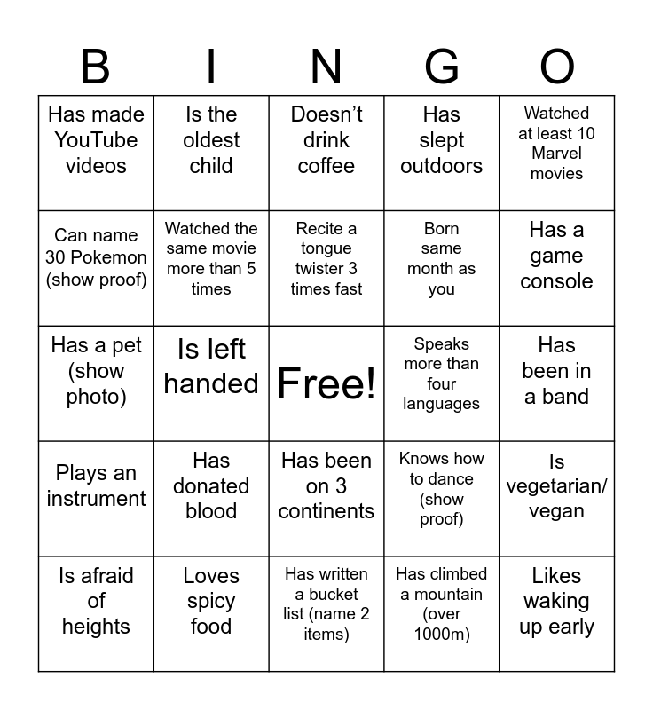 This bingo card has a free space and 24 words: Has donated blood, Loves spicy food, Recite a tongue twister 3 times fast, Is afraid of heights, Watched at least 10 Marvel movies, Has made YouTube videos, Can name 30 Pokemon (show proof), Is the oldest child, Speaks more than four languages, Has been on 3 continents, Born same month as you, Has a pet (show photo), Knows how to dance (show proof), Is vegetarian/ vegan, Watched the same movie more than 5 times, Has climbed a mountain (over 1000m), Has been in a band, Doesn’t drink coffee, Has a game console, Is left handed, Likes waking up early, Plays an instrument, Has slept outdoors and Has written a bucket list (name 2 items).