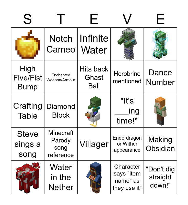 This bingo card has 6 images, a free space and 18 words: Minecraft Parody song reference, Water in the Nether, Hits back Ghast Ball, High Five/Fist Bump, Notch Cameo, "It's ___ing time!", Villager, Herobrine mentioned, Crafting Table, Enderdragon or Wither appearance, Making Obsidian, Enchanted Weapon/Armour, Character says "item name" as they use it", Infinite Water, Dance Number, Diamond Block, "Don't dig straight down!" and Steve sings a song.