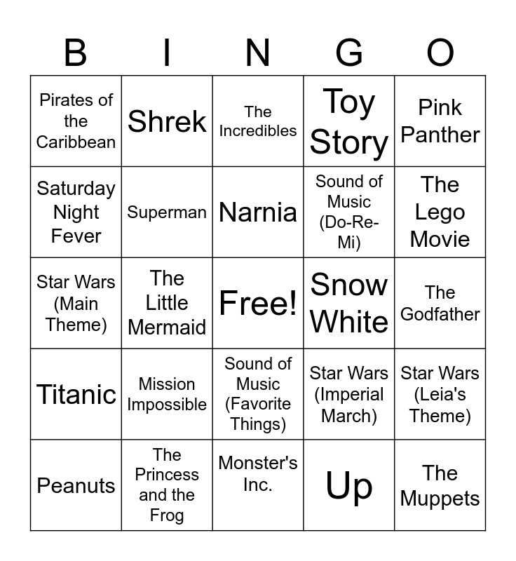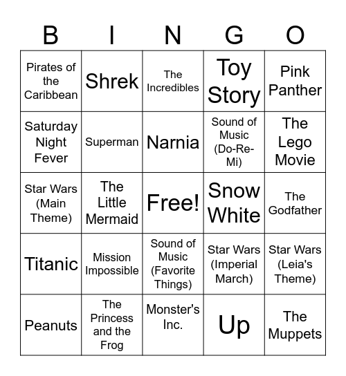 This bingo card has a free space and 25 words: Mission Impossible, Monster's Inc., Narnia, Peanuts, Pink Panther, Pirates of the Caribbean, Saturday Night Fever, Shrek, Snow White, Sound of Music (Favorite Things), Sound of Music (Do-Re-Mi), Star Wars (Main Theme), Star Wars (Imperial March), Star Wars (Leia's Theme), Superman, Tarzan, The Godfather, The Incredibles, The Lego Movie, The Little Mermaid, The Muppets, The Princess and the Frog, Titanic, Toy Story and Up.