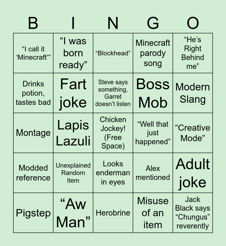 This bingo card has a free space and 29 words: Pigstep, Villager gets kissed / kisses, Lapis Lazuli, Cut content referenced, “I call it ‘Minecraft’”, “Blockhead”, Fart joke, Unexplained Random Item, “Well that just happened”, “Aw Man”, “Creative Mode”, Jack Black says “Chungus” reverently, Herobrine, Misuse of an item, Modern Slang, Piglins want to invade the real world, Looks enderman in eyes, Modded reference, “He’s Right Behind me”, Montage, Alex mentioned, Continuity Error, Boss Mob, Drinks potion, tastes bad, Minecraft parody song, “I was born ready”, Adult joke, Steve says something, Garret doesn’t listen and Wandering Trader.