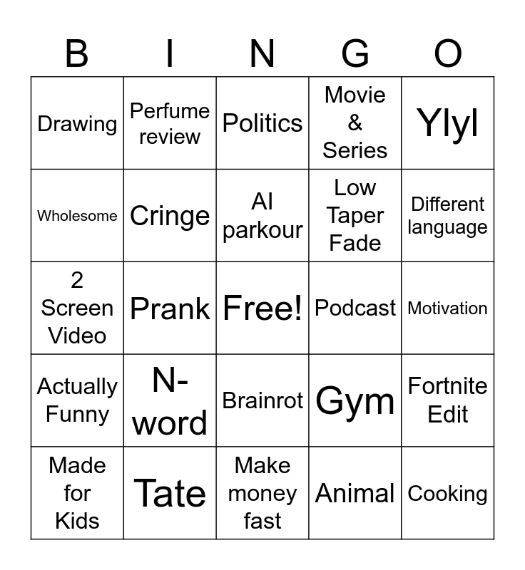 This bingo card has a free space and 24 words: N-word, Tate, AI parkour, Made for Kids, Ylyl, Drawing, Wholesome, Perfume review, Podcast, Brainrot, Low Taper Fade, 2 Screen Video, Gym, Fortnite Edit, Cringe, Animal, Motivation, Politics, Different language, Prank, Cooking, Actually Funny, Movie & Series and Make money fast.