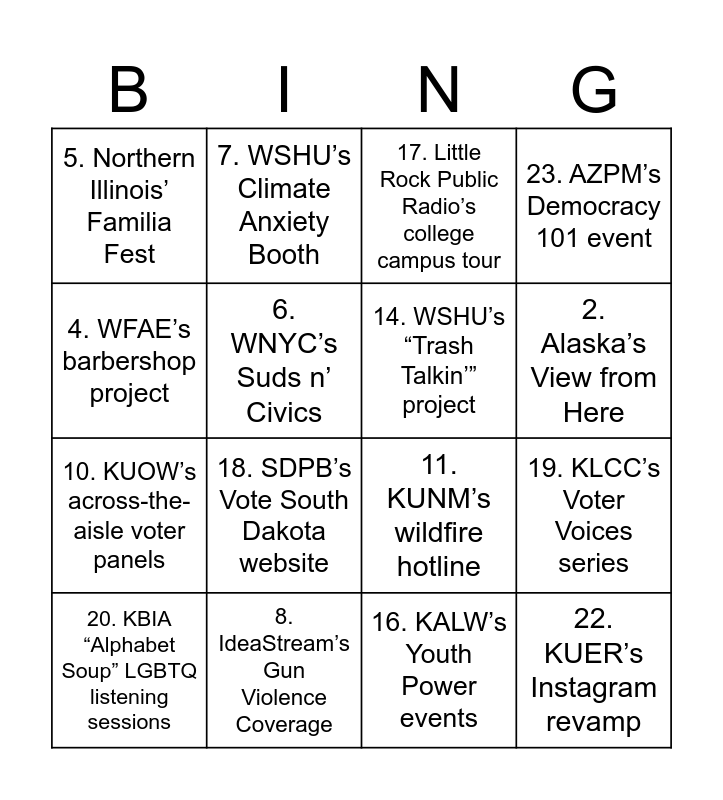 This bingo card has 25 words: Free!, 1. Montana Public’s Road Trip, 2. Alaska’s View from Here, 3. Gulf States’ District 2 project, 4. WFAE’s barbershop project, 5. Northern Illinois’ Familia Fest, 6. WNYC’s Suds n’ Civics, 7. WSHU’s Climate Anxiety Booth, 8. IdeaStream’s Gun Violence Coverage, 9. KAXE’s first voter guide, 10. KUOW’s across-the-aisle voter panels, 11. KUNM’s wildfire hotline, 12. Vermont Public’s Citizens Agenda, 13. GBH’s Politics IRL series, 14. WSHU’s “Trash Talkin’” project, 15. Maine Public’s trivia nights, 16. KALW’s Youth Power events, 17. Little Rock Public Radio’s college campus tour, 18. SDPB’s Vote South Dakota website, 19. KLCC’s Voter Voices series, 20. KBIA “Alphabet Soup” LGBTQ listening sessions, 21. Virginia Public Media’s Reddit AMAs, 22. KUER’s Instagram revamp, 23. AZPM’s Democracy 101 event and 24. Wyoming Public Radio’s campus outreach.