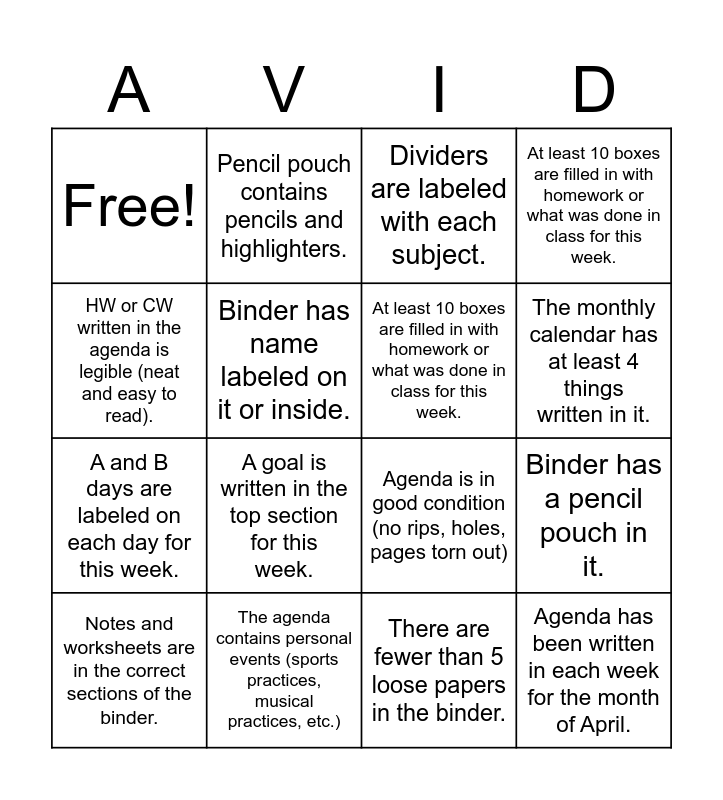 This bingo card has 19 words: Notes and worksheets are in the correct sections of the binder., Binder has dividers for each subject., Dividers are labeled with each subject., Binder has a pencil pouch in it., HW or CW written in the agenda is legible (neat and easy to read)., Pencil pouch contains pencils and highlighters., There are fewer than 5 loose papers in the binder., At least 10 boxes are filled in with homework or what was done in class for this week., Free!, A goal is written in the top section for this week., At least 10 boxes are filled in with homework or what was done in class for this week., The monthly calendar has at least 4 things written in it., A and B days are labeled on each day for this week., The agenda contains personal events (sports practices, musical practices, etc.), Agenda is in good condition (no rips, holes, pages torn out), Agenda has been written in each week for the month of April., HW or CW written in the agenda is legible (neat and easy to read)., Binder has name labeled on it or inside. and Agenda has been written in each week for the month of April..