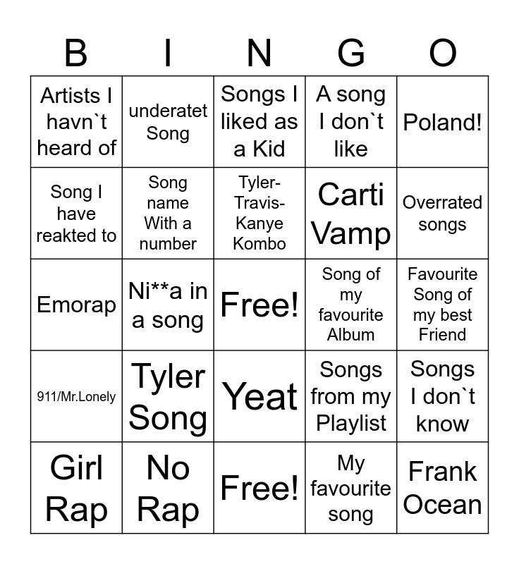 This bingo card has a free space and 24 words: Tyler Song, No Rap, Tyler-Travis-Kanye Kombo, Girl Rap, Poland!, Artists I havn`t heard of, Song I have reakted to, underatet Song, Song of my favourite Album, Yeat, Carti Vamp, Emorap, Songs from my Playlist, Songs I don`t know, Song name With a number, My favourite song, Favourite Song of my best Friend, Songs I liked as a Kid, Overrated songs, Ni**a in a song, Frank Ocean, 911/Mr.Lonely, A song I don`t like and Free!.