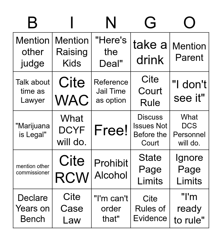 This bingo card has a free space and 24 words: Cite RCW, Cite Case Law, Reference Jail Time as option, Declare Years on Bench, Mention Parent, Mention other judge, Talk about time as Lawyer, Mention Raising Kids, Discuss Issues Not Before the Court, Prohibit Alcohol, Cite Court Rule, "Marijuana is Legal", State Page Limits, Ignore Page Limits, Cite WAC, Cite Rules of Evidence, What DCS Personnel will do., "Here's the Deal", "I don't see it", What DCYF will do., "I'm ready to rule", mention other commissioner, take a drink and "I'm can't order that".