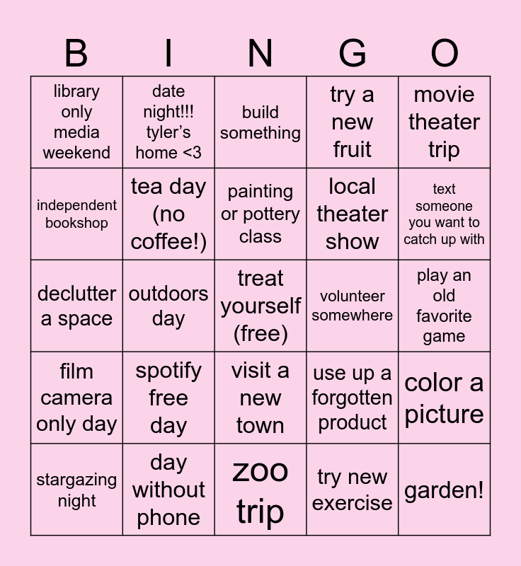 This bingo card has a free space and 24 words: spotify free day, day without phone, painting or pottery class, stargazing night, movie theater trip, library only media weekend, independent bookshop, date night!!! tyler’s home <3, volunteer somewhere, visit a new town, local theater show, declutter a space, use up a forgotten product, color a picture, tea day (no coffee!), try new exercise, play an old favorite game, build something, text someone you want to catch up with, outdoors day, garden!, film camera only day, try a new fruit and zoo trip.