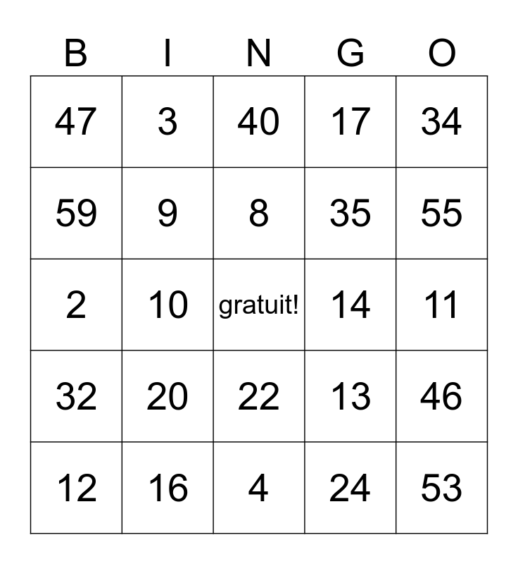 This bingo card has a free space and 24 words: 20, 16, 8, 12, 34, 47, 59, 3, 14, 22, 35, 2, 13, 46, 9, 24, 11, 40, 55, 10, 53, 32, 17 and 4.